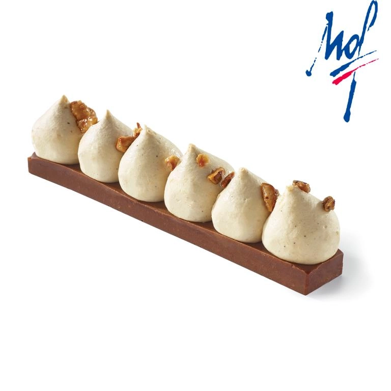 Chocolate and praline crunchy biscuit, chocolate and hazelnut ganache, coffee and white chocolate mousse topped with caramelised hazelnuts.