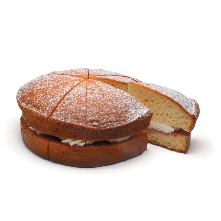 A soft victoria sponge with cream and strawberry jam sprinkled with icing sugar. Pre cut into 12 portions.
